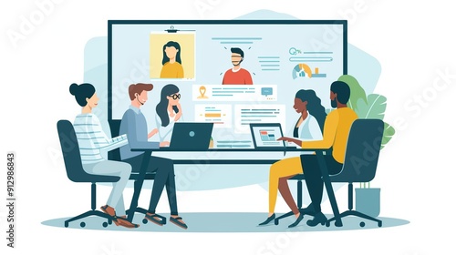 Fototapeta premium A flat vector illustration of business people in an office setting, with some sitting at desks and others standing around them speaking or presenting something on their laptops.