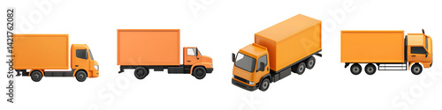 © R Studio, Fototapeta premium A fleet of orange delivery trucks in various sizes. long_title:A collection of different sized orange cargo trucks and delivery vans, depicting a