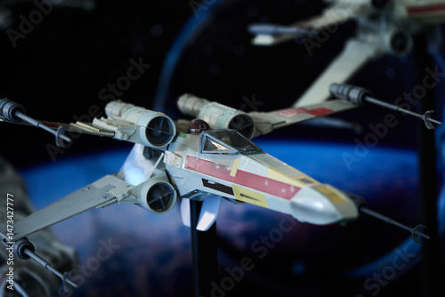 Fototapeta premium A fleet of X-wing fighter figures arranged in outer space setup in San...