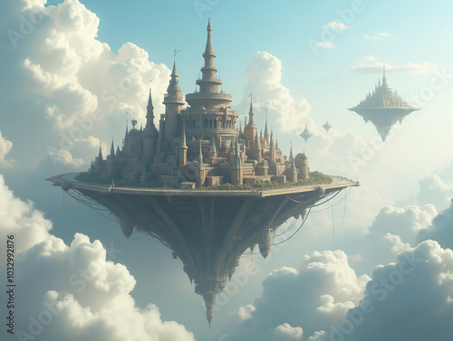 © Ali, Obraz premium A floating city in the clouds, steampunk-inspired airships hovering nearby
