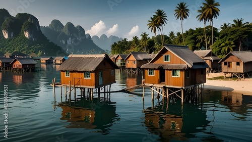 © JohnnyMohAzar, Fototapeta premium A floating village with wooden houses on stilts over the water