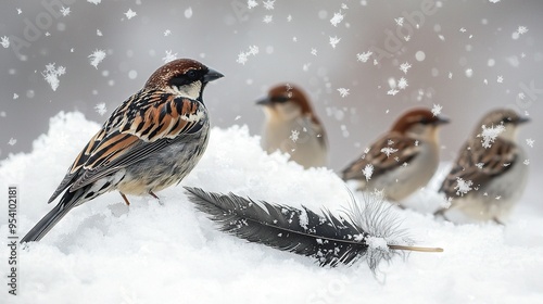 Obraz premium A flock of avians perched atop a mound of snow alongside a feather resting on...
