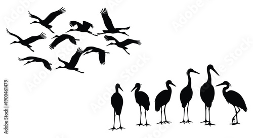 Naklejka premium A flock of birds in flight and wading black silhouette