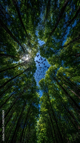 © Wildan, Naklejka premium A Flock of Birds Soars Through a Sun-Dappled Forest Canopy, Viewed from Below