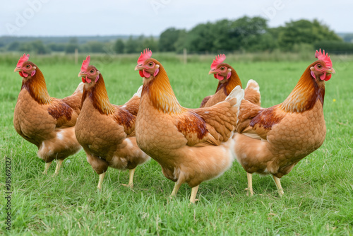 © Florian Dussart, Fototapeta premium A flock of brown hens standing together on a grassy pasture