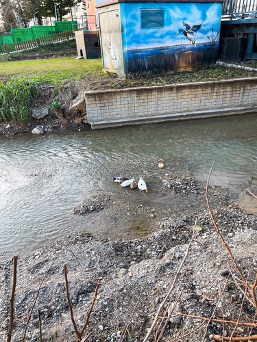 © Projecturk, Fototapeta premium A flock of Ducks swimming in a river water