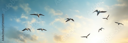 Fototapeta premium A flock of five birds are flying in the sky, wide light, 2d illustration,