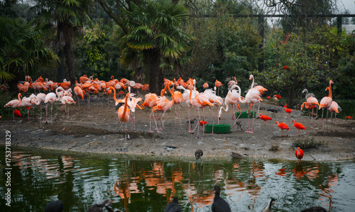 © Harry, Naklejka premium A flock of flamingos are standing in a pond