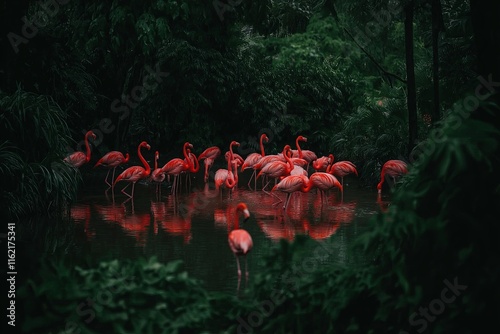 Naklejka premium A flock of flamingos wading gracefully through shallow water, their...