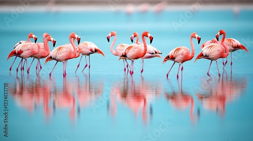 Naklejka premium A flock of flamingos wading in a shallow lagoon