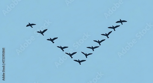 Fototapeta premium A flock of geese flying in a V formation against a clear blue sky representing teamwork and direction