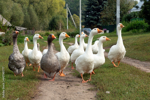 © Andrey, Obraz premium A flock of geese walks through the village.