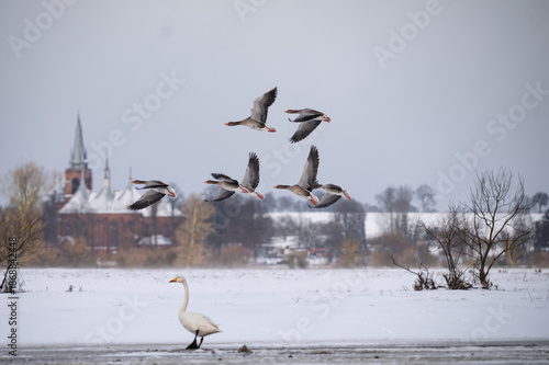 © Robert, Fototapeta premium A flock of greylag geese in flight over a frozen lake