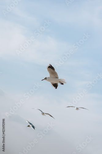 Obraz premium A flock of large, beautiful white sea gulls fly against the blue sky, soaring...