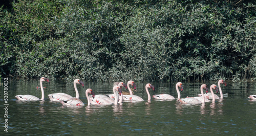Naklejka premium A flock of lesser flamingo (Phoeniconaias minor) seen swimming in the wetlands near Airoli in New Bombay in Maharashtra, India