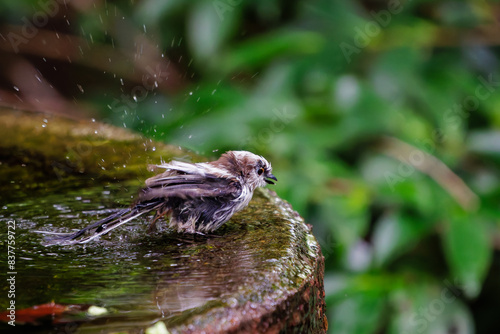 Fototapeta premium 泉で水浴びをする可愛いエナガ(エナガ科)の幼鳥の群れ。日本国神奈川県秦野市、弘法山公園、権現山バードサンクチュアリにて。 2022年7月撮影。A...