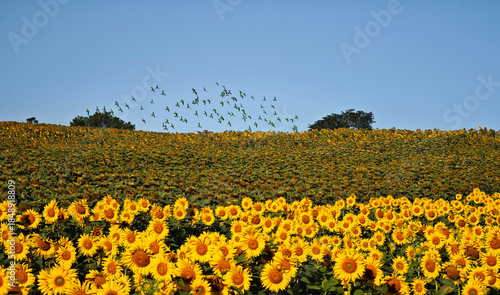 © Chaaim, Obraz premium a flock of parrots flying over a sunflower field
