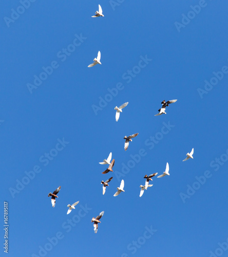 © schankz, Obraz premium A flock of pigeons on a blue sky