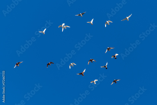 © schankz, Obraz premium A flock of pigeons on a blue sky