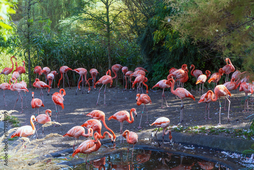© Kassandra, Naklejka premium A flock of pink flamingo birds in the park