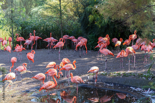 © Kassandra, Naklejka premium A flock of pink flamingo birds in the park
