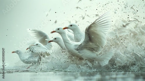 Fototapeta premium A flock of seagulls are flying through the air and splashing water