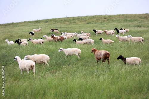 © zhengzaishanchu, Obraz premium A flock of sheep are eating grass on the grassland