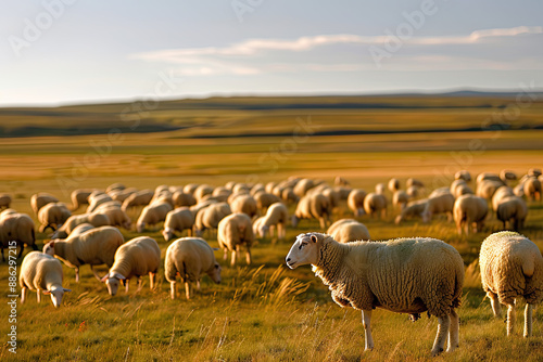 © Oranuch, Fototapeta premium A flock of sheep grazing on a grassy hill