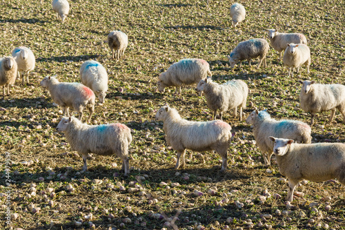 © David Pimborough, Obraz premium A flock of sheep grazing on stubble turnips a commonly used winter feed when quality grass is in short supply