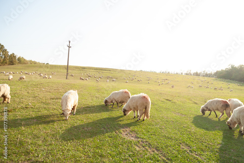 Fototapeta premium A flock of sheep grazing peacefully on a grassy hillside bathed in sunlight.