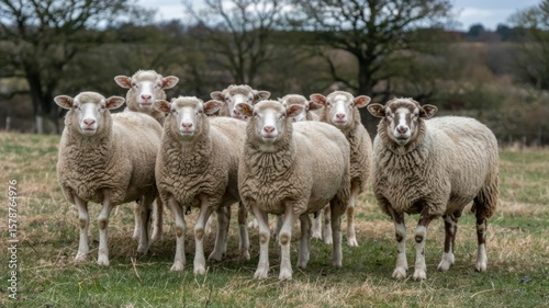 Fototapeta premium A flock of sheep standing together in a grassy field on a cloudy day