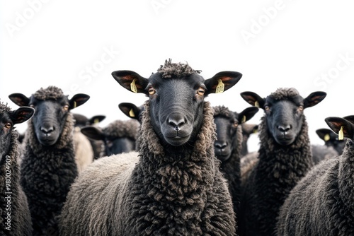 © PHB Stock, Fototapeta premium A flock of sheep with one black sheep set against a white backdrop