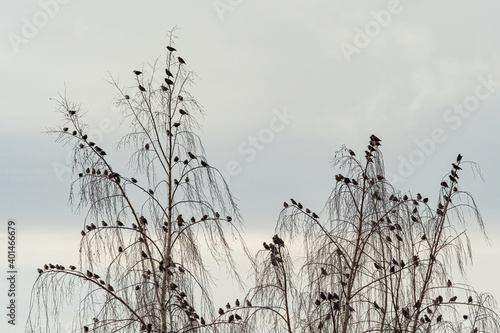Obraz premium a flock of starling birds resting on the thin branches of leafless trees in the park on an overcast day