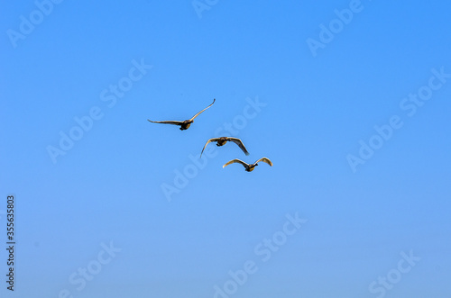 © baxys, Obraz premium A flock of swans in the morning blue sky.