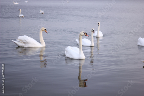 Fototapeta premium A flock of white swans floating on the reflective water of the lake.