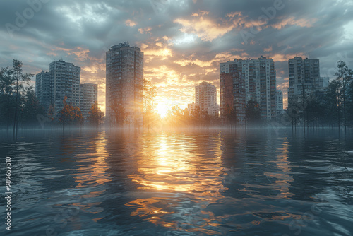 © Sebastian, Fototapeta premium A flooded coastal city with buildings partially submerged in water. Concept of rising sea levels due to climate change.