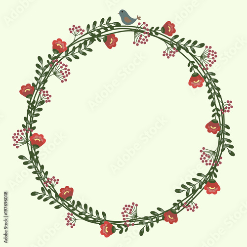 © aisedora, Fototapeta premium A floral round frame with a bird, red flowers, berries and twigs. Vector.
