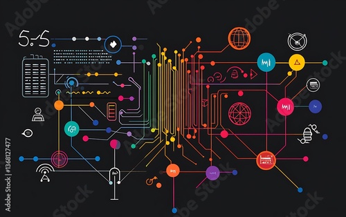 © Tanish, Obraz premium A flow chart with multiple connected lines and colorful dots representing data