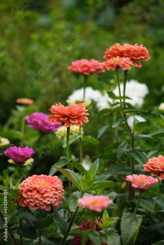 © Grigoriy, Obraz premium A flower bed with zinnias in the garden