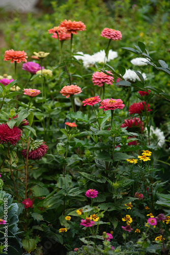 © Grigoriy, Naklejka premium A flower bed with zinnias in the garden