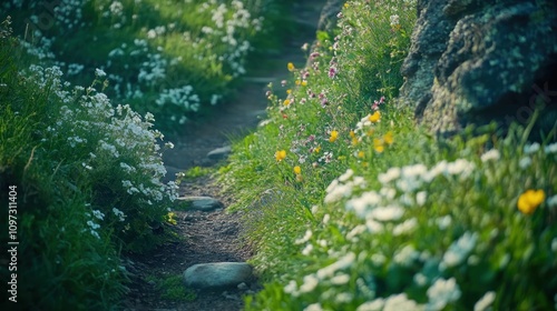 Fototapeta premium A flower lined path meanders through green meadows