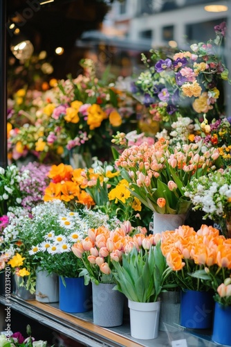 Fototapeta premium A flower shop window display bursting with colorful spring blooms, sprint flower