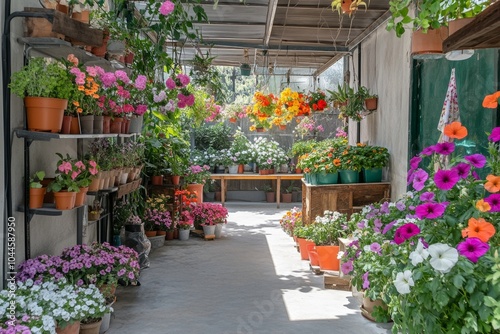 © Teerasit, Fototapeta premium A flower shop with various colorful flowers in pots on a sunny day.