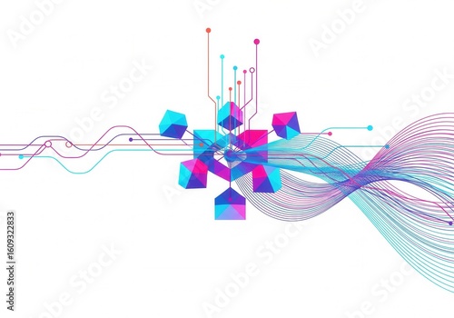 © Andrey, Fototapeta premium A flowing abstract design of blue and pink wavy lines with geometric shapes.This abstract image presents a dynamic composition of interconnected lines and geometric cubes