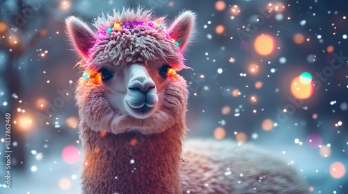 Obraz premium A fluffy alpaca in a snowy field with colorful lights woven through its fur. .