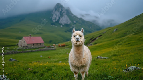 © Pisahouse, Naklejka premium A fluffy alpaca stands in a green landscape with mountains and a quaint house in the background under cloudy skies.