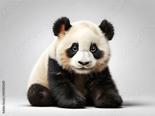 Naklejka premium A fluffy baby giant panda cub sits attentively against a soft, neutral grey...