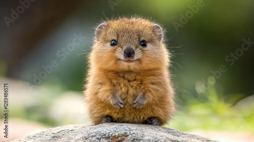Naklejka premium A fluffy baby quokka sitting on a rock, its round face and adorable smile radiating happiness