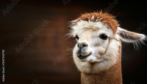 Fototapeta premium A fluffy brown alpaca poses with a whimsical head tilt, radiating joy and curiosity. This lighthearted moment captures the soothing essence of this lovable creature, perfect for animal lovers