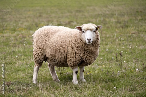 © Ioan, Fototapeta premium A fluffy brown sheep standing in a grassy field